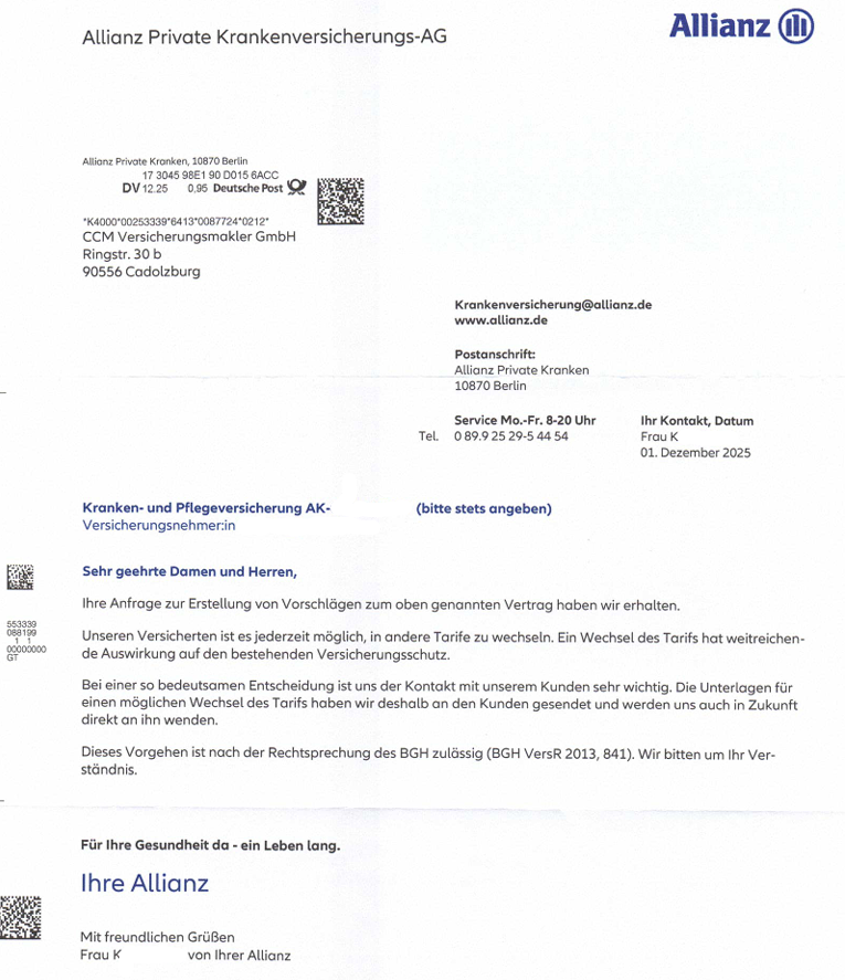 In den letzten Monaten erreichen uns vermehrt Rückmeldungen der Allianz, die eines gemeinsam haben: Der Tarifwechsel nach § 204 VVG wird nicht verweigert – aber gezielt erschwert.