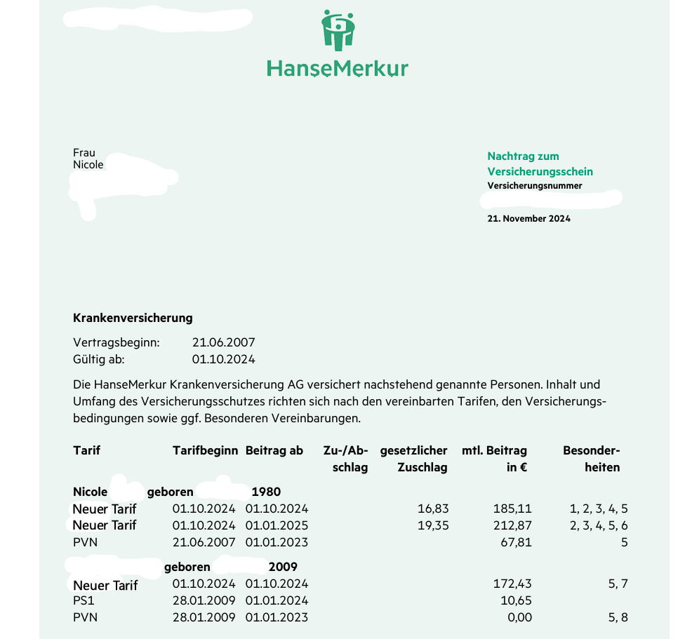 Unsere Kundin Nicole ist gemeinsam mit ihrer Tochter seit 2007 bei der HanseMerkur privatversichert. Aufgrund der inzwischen stark gestiegenen Beiträge suchte sie den Kontakt zu uns über eine Empfehlung, bei der ebenfalls eine erfolgreiche Tarifoptimierung durchgeführt wurde. Für beide versicherten Personen lag der Gesamtbeitrag zum 01.01.2025 insgesamt bei 850,76€ monatlich. Nicole war im Tarif KVE2 versichert und ihre Tochter im Tarif KV1 + VKE + PS1.
