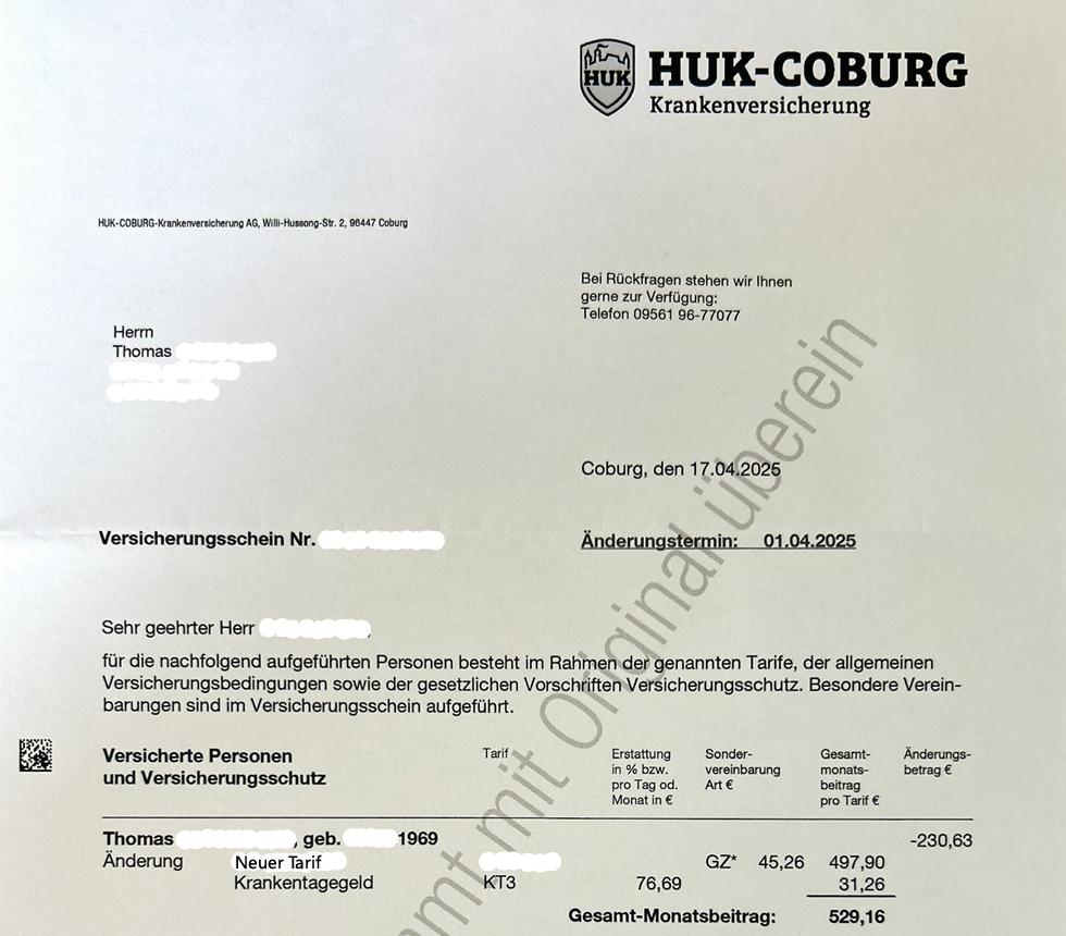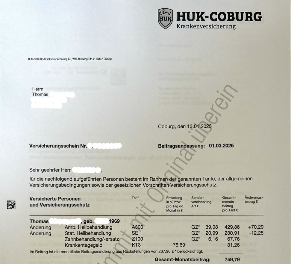 Unser Kunde Thomas ist Baujahr 1969 und wandte sich Anfang 2025 aufgrund der erneut gestiegenen PKV-Beiträge innerhalb der HUK an uns. Für seine Tarifkombination A300, SE, Z100 und KT3 sollte er ab dem 01.03.2025 759,79€ monatlich bezahlen. Thomas befürchtete, dass er sich die PKV-Beiträge im Rentenalter bei weiteren Anstiegen nicht mehr leisten könne. So sah sein alter Versicherungsschein aus:
