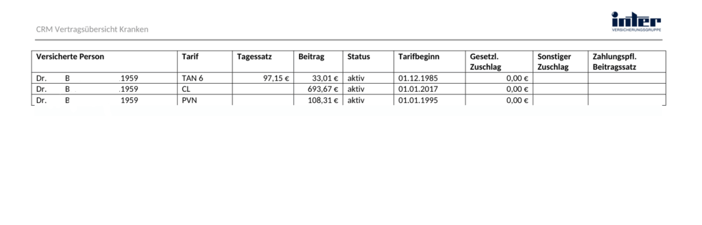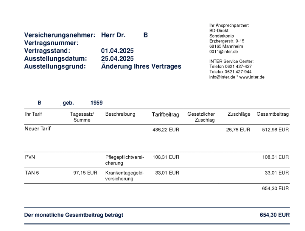 Dr. B. ist Baujahr 1959 und bereits seit seinem 7. Lebensjahr bei der Inter versichert. Für den Tarif CL zahlte er inkl. Pflegeversicherung und Krankentagegeld 834,99€ monatlich. Für einen Rentner ein inzwischen sehr hoher Beitrag. So sah sein alter Vertragsstand vor dem Tarifwechsel aus: